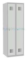 De kast bestaat uit twee kolommen, elk voorzien van één deur met perforatiesleuven voor optimale ventilatie. Aan de binnenzijde van elke kolom bevindt zich een legbord en een kledingstang met haken, waardoor zowel kleding als accessoires netjes kunnen worden opgeborgen. Zelfklevende labelhouders worden standaard meegeleverd voor eenvoudige identificatie van de vakken.