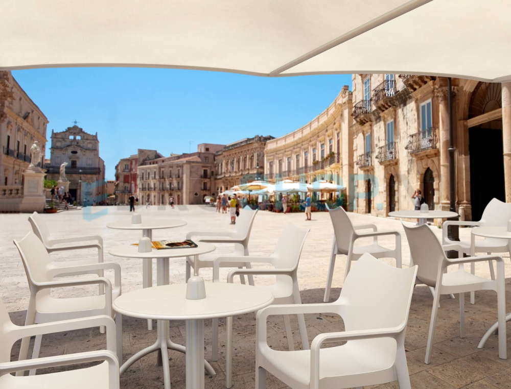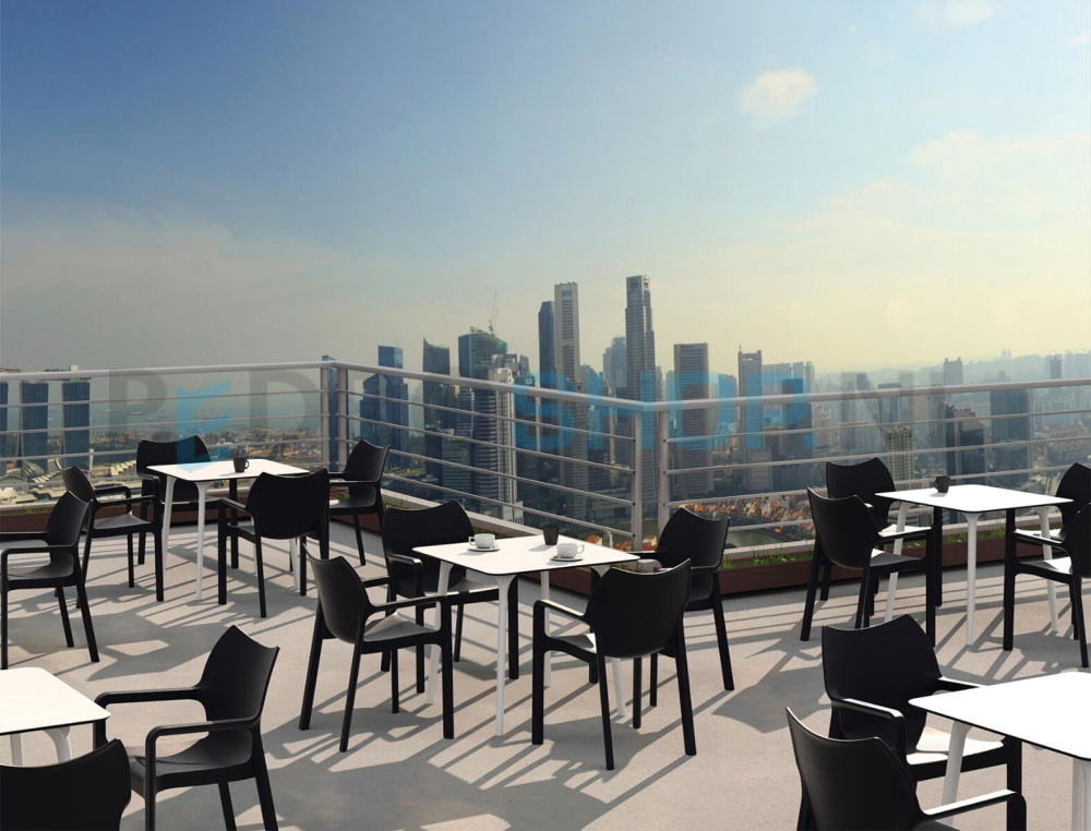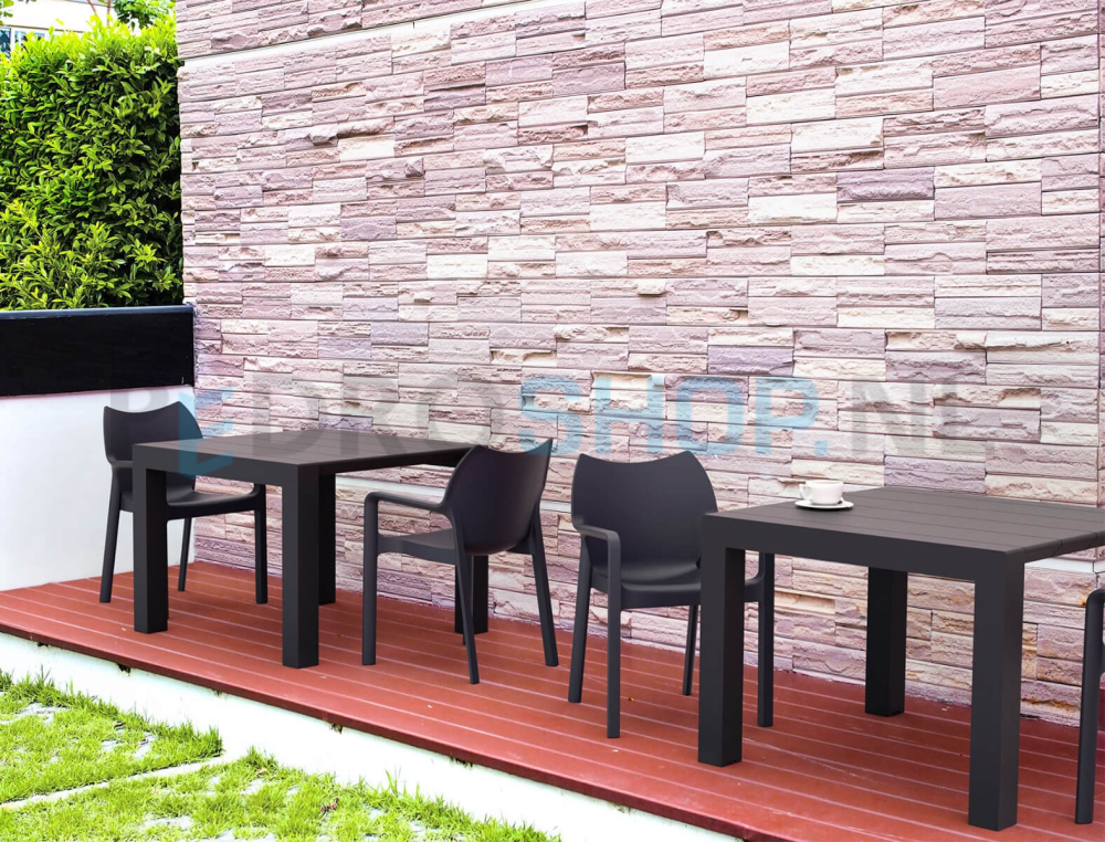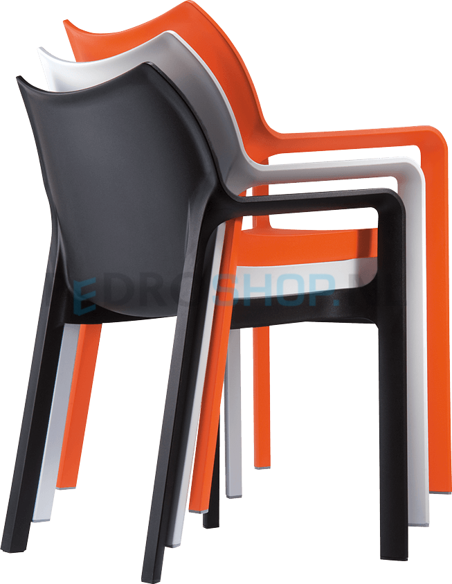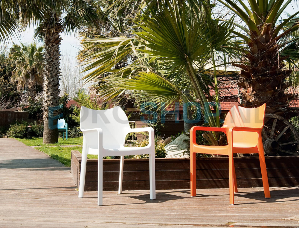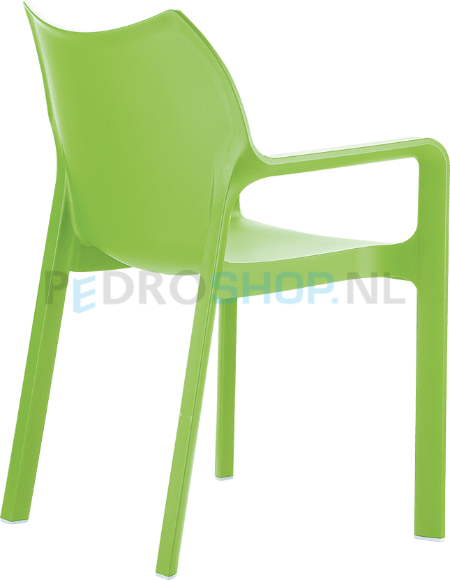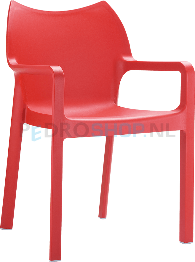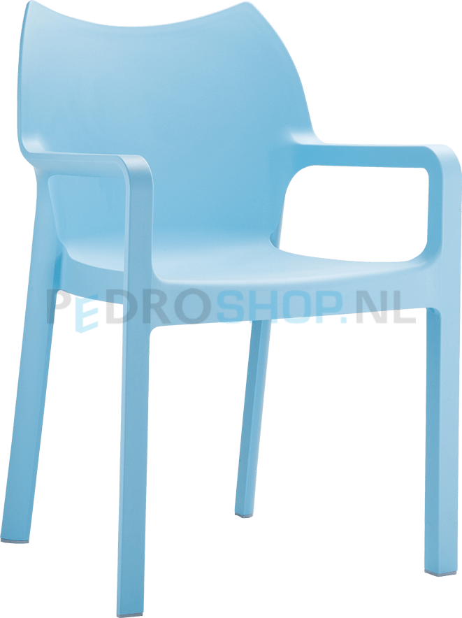 Een robuuste armstoel in 100% recyclebaar polypropyleen. Stapelbaar en geschikt voor binnen en buiten. Uit voorraad leverbaar in 8 kleuren.