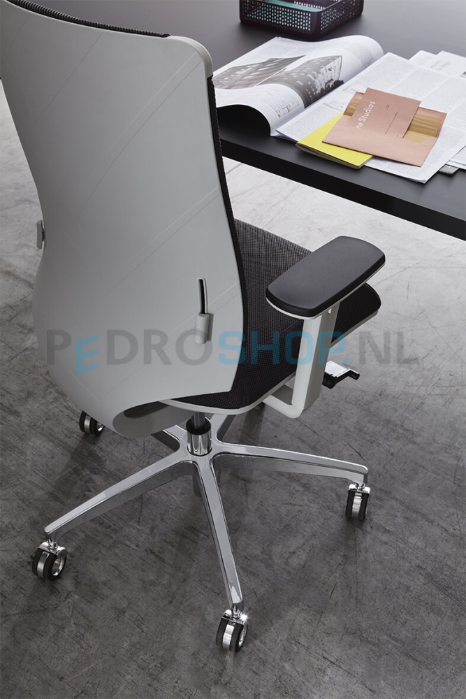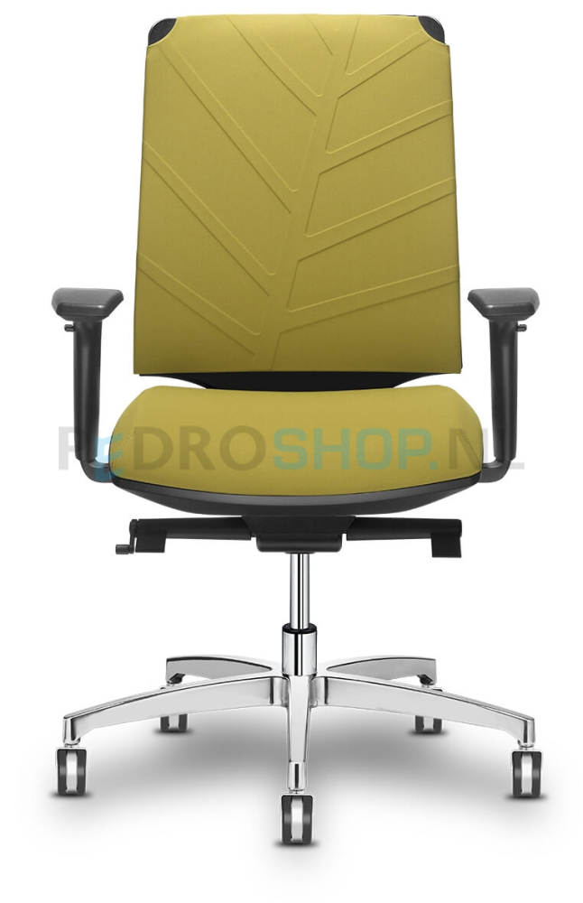 De Leaf bureaustoel, de laatste ontwikkelingen en materialen in één bureaustoel en voor 98% recyclebaar (C2C). - Innovatieve mesh rug in 2 variaties - Rugsupport in zwart of witgrijs met verstelbare lendensteun - Gestoffeerde comfort zitting - Zitting in unieke facetvorm 75 mm dik - Schuifzitting met 5cm free-floating - Synchroon mechanisme - Rugleuning anti-panic te fixeren in 5 posities - Rugcontact gewichtsafhankelijk instelbaar - Zwart, witgrijs of aluminium gepolijst onderstel - 50 mm geremde wielen - Armleggers optioneel in diverse uitvoeringen