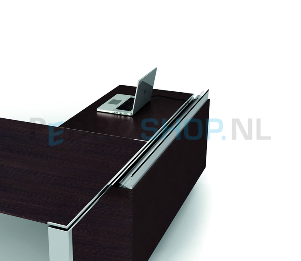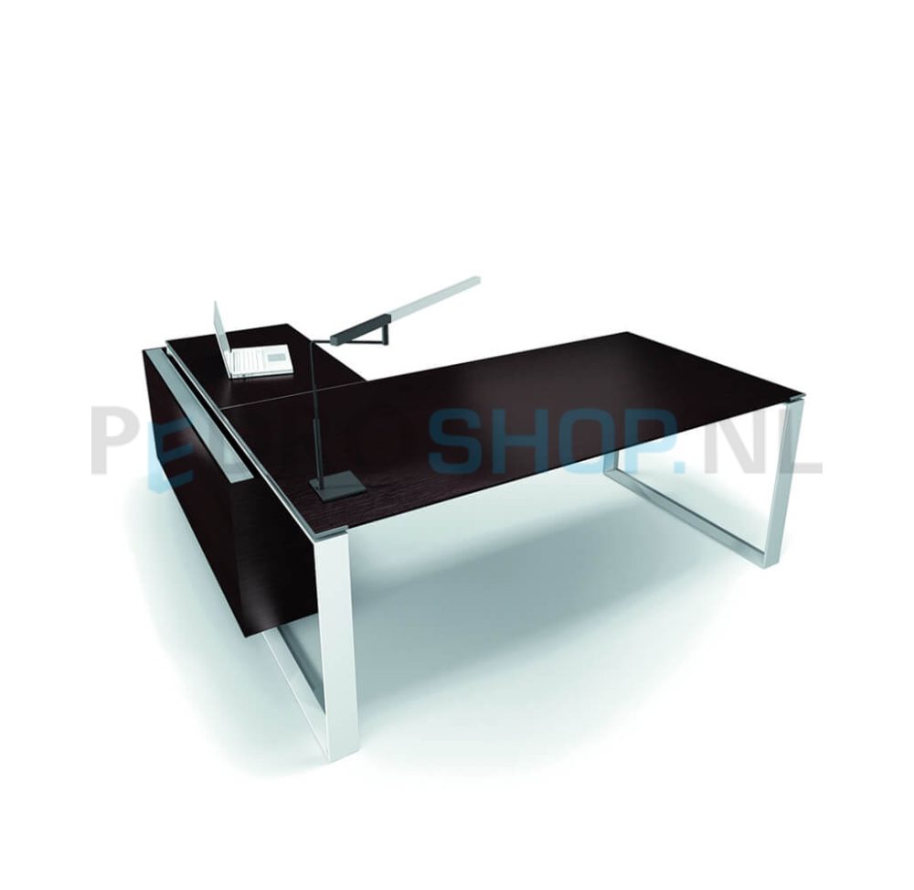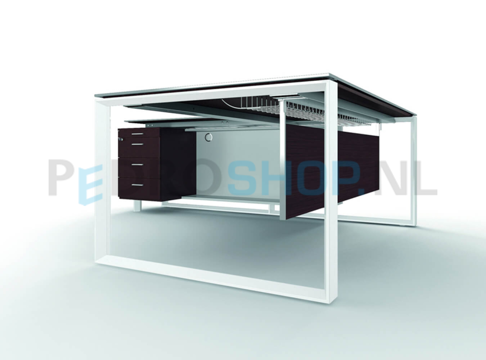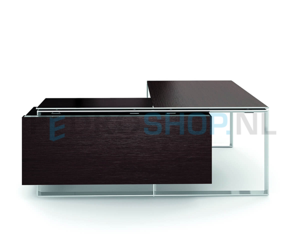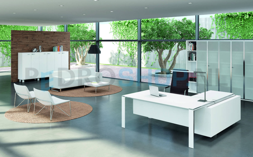 X7 meubilair van Officity (by Quadrifoglio), Italiaans design voor directiekamer en vergaderruimte. Vakmanschap in metaalbewerking, zoals de fraaie chromen of witte poten (in 4-poots OPEN of ringvorm CLOSED), met 10mm dunne zwevende geprofileerde bladen van melamine, glas of gelakt hout. Aantrekkelijke accenten zoals de chromen bladhoeken en het slimme kabelmanagement maken van dit praktische meubel een ware eye-catcher. Levertijd 4-6 weken.
