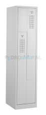 De kast bestaat uit één kolom met twee deuren en heeft een sterke gelaste staalconstructie. De duurzame structuur poedercoating beschermt de kast tegen slijtage en dagelijks gebruik. Standaard is elke deur uitgevoerd met een uniek cilinderslot inclusief twee sleutels. Optioneel zijn ook andere slotvarianten mogelijk.