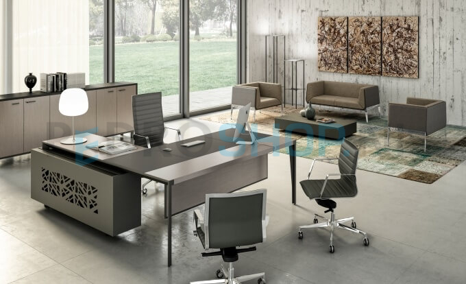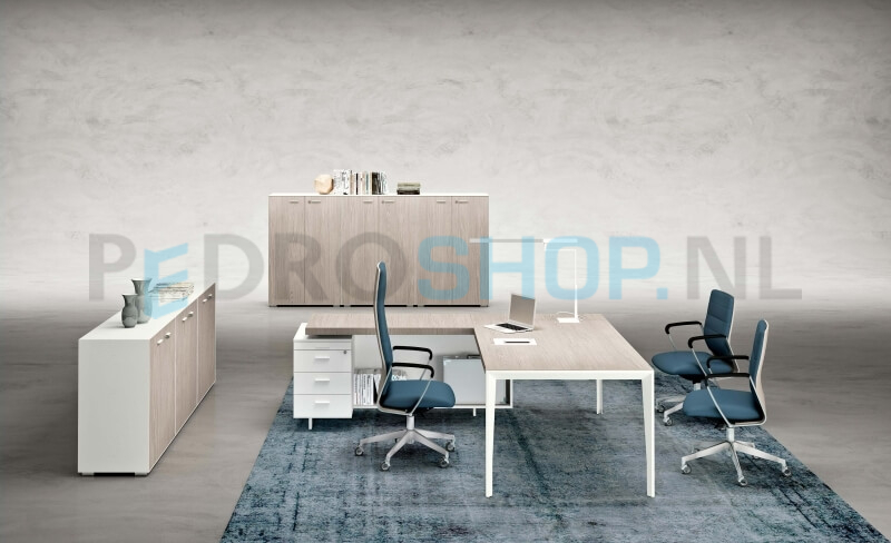X9 bureau van Quadrifoglio. X5 is ontworpen om uw directiekamer perfect in te kunnen richten door haar eindeloze configuraties en tijdloze uitstraling. Het metalen onderstel is leverbaar in wit en shadow grey en de bladen zijn uitgevoerd in melamine (leverbaar in 6 kleuren). Designed by Polloni