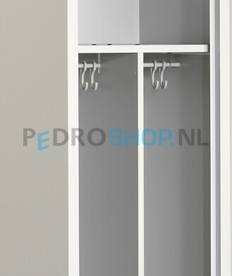 De PDC-T210 garderobekast is speciaal ontworpen voor situaties waarin schone en vuile kleding of privé- en werkkleding gescheiden moeten worden opgeborgen. Deze kast beschikt over 2 kolommen met elk een eigen deur. Achter iedere deur bevindt zich een verdeelschot dat het vak in twee compartimenten opsplitst. Bovenin is per kolom een legbord geplaatst, met daaronder aan beide zijden van het verdeelschot een kledingstang met haken. Zo blijft kleding overzichtelijk, hygiënisch en netjes gescheiden.