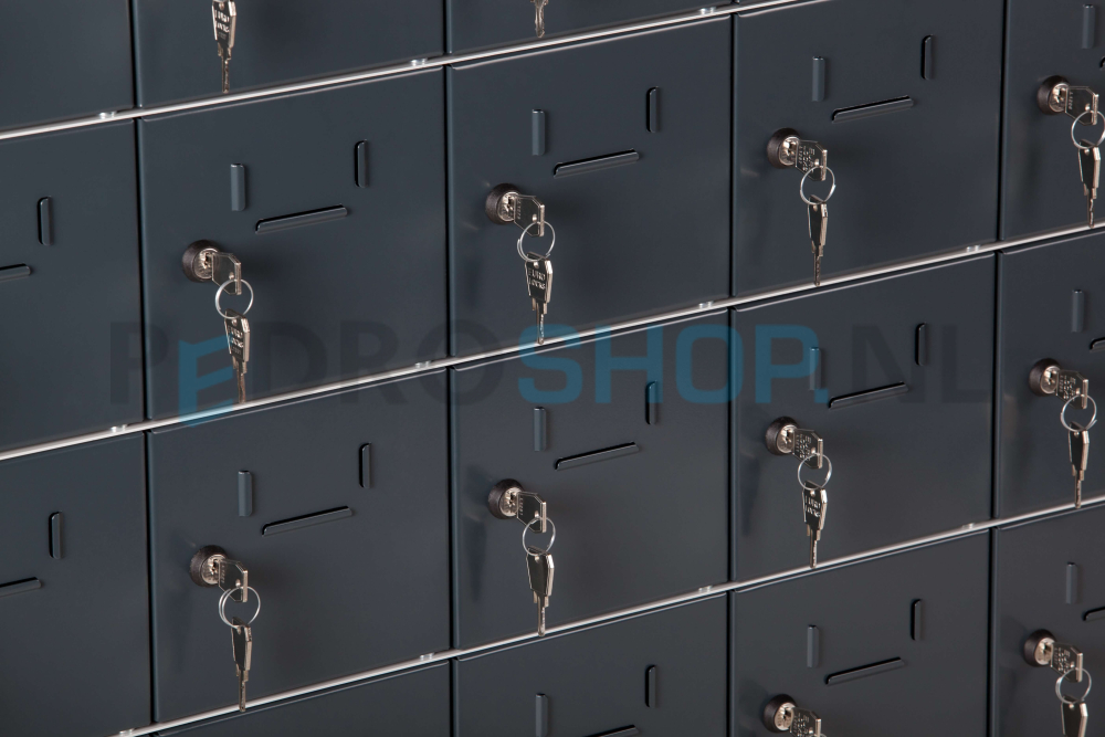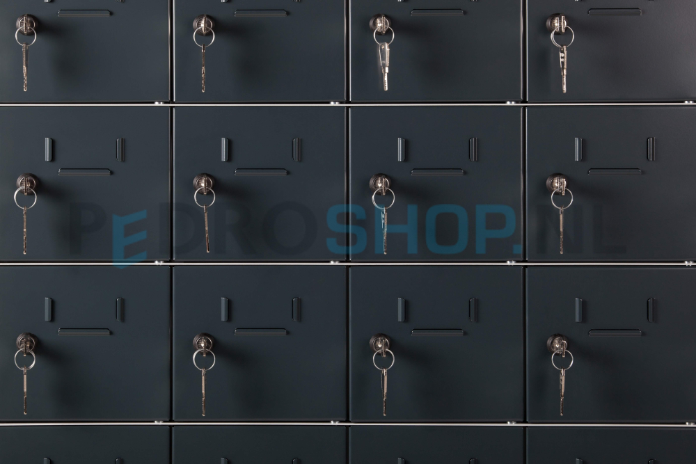 Met een afmeting van h109 x b43 x d30 cm biedt de kast voldoende ruimte voor 10 mini lockers, verdeeld over 2 kolommen met ieder 5 lockers. Elke locker heeft een afmeting van h16 x b15 x d27 cm.